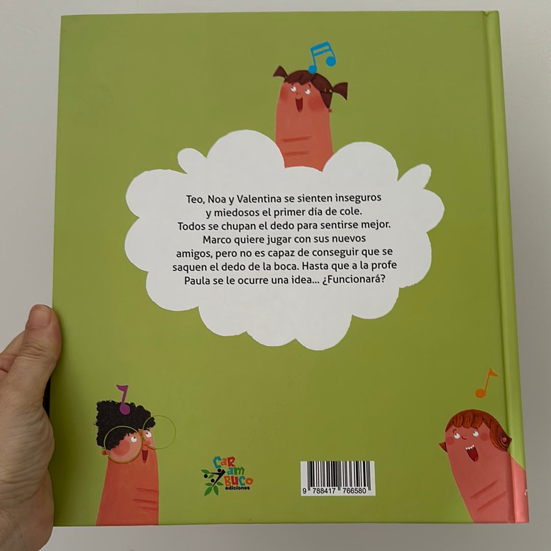 Teo, Noa y Valentina se sienten inseguros y miedosos el primer día de cole. Todos se chupan el dedo para sentirse mejor. Marco quiere jugar con sus nuevos amigos, pero no es capaz de conseguir que se saquen el dedo de la boca. Hasta que a la profe Paula se le ocurre una idea... ¿Funcionará?